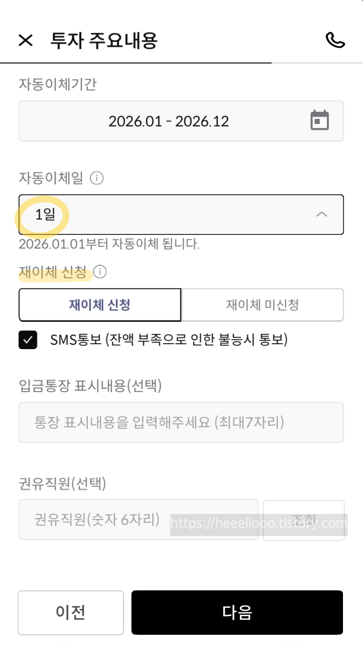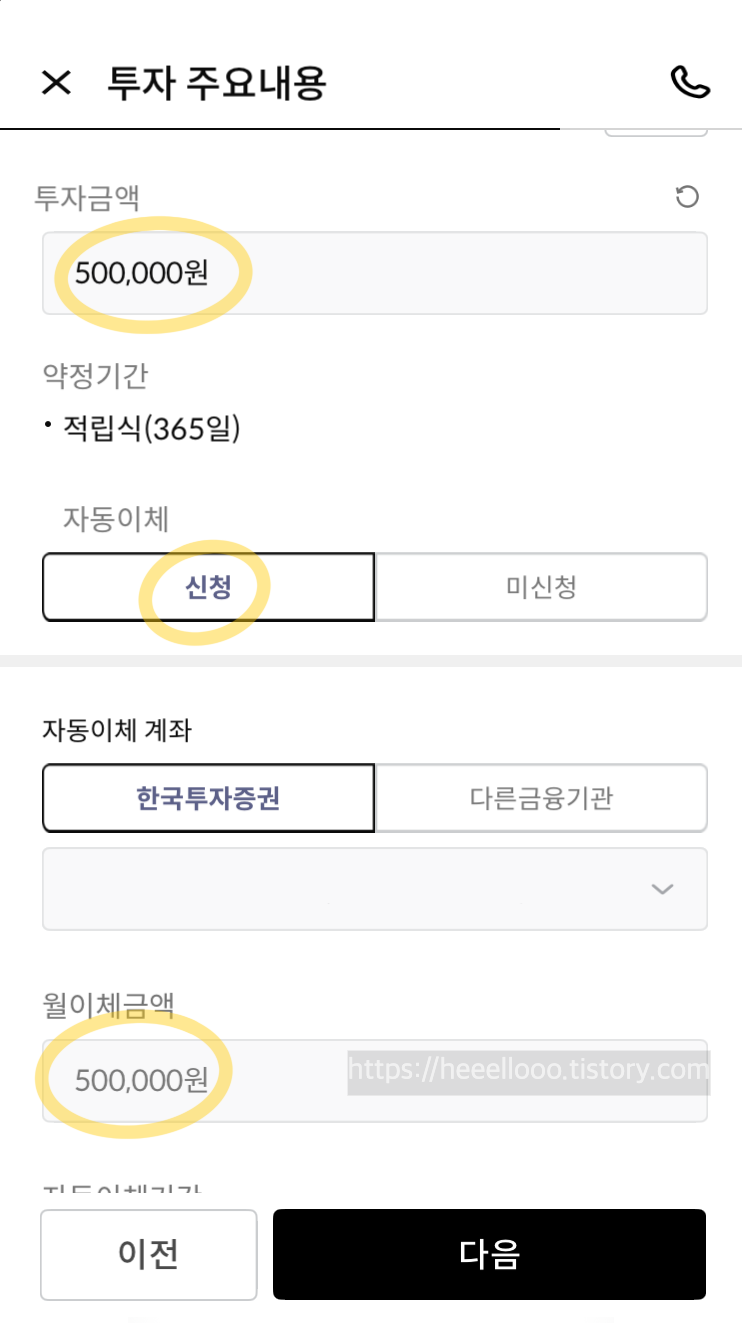 - 투자 금액을 입력하고, 자동이체를 신청하면 자동이체 계좌를 설정할 수 있습니다.
