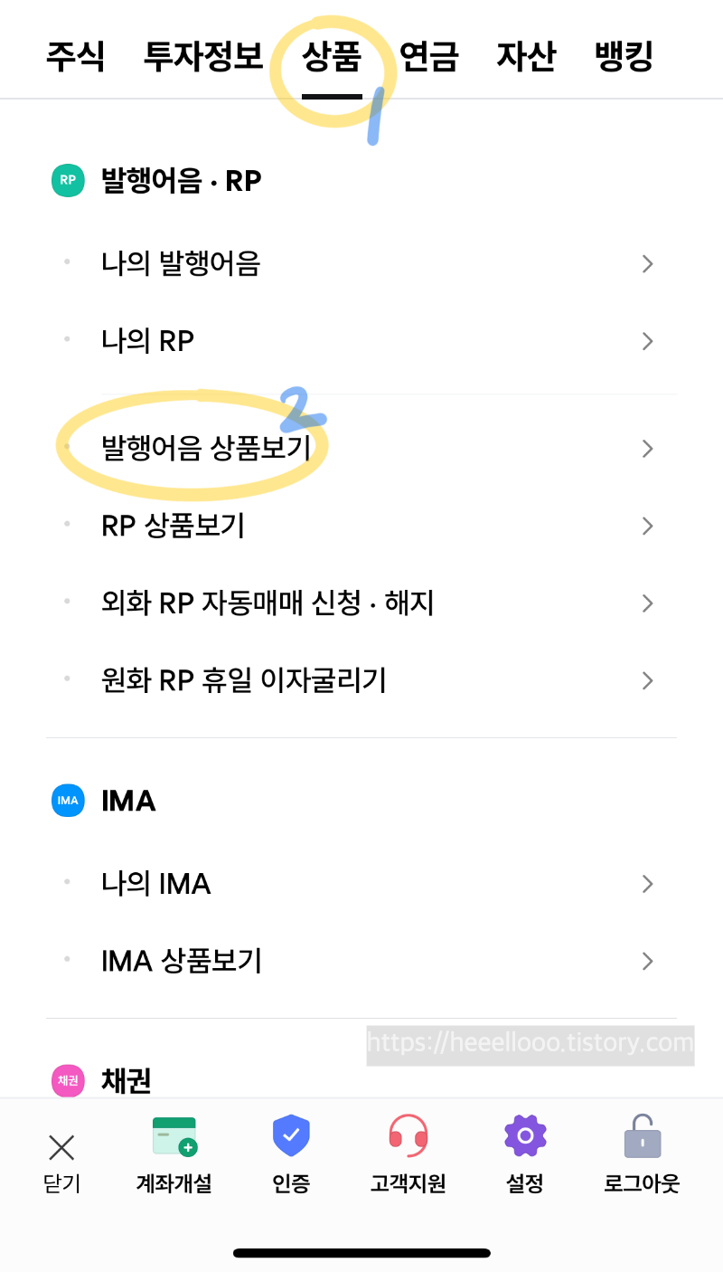 - 한국투자증권 앱 > 메뉴 > 상품 > 발행어음 상품보기