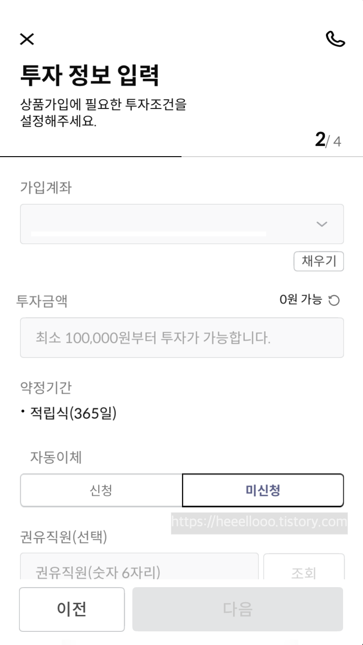 - 가입할 계좌를 선택하고, 투자금액을 입력합니다.